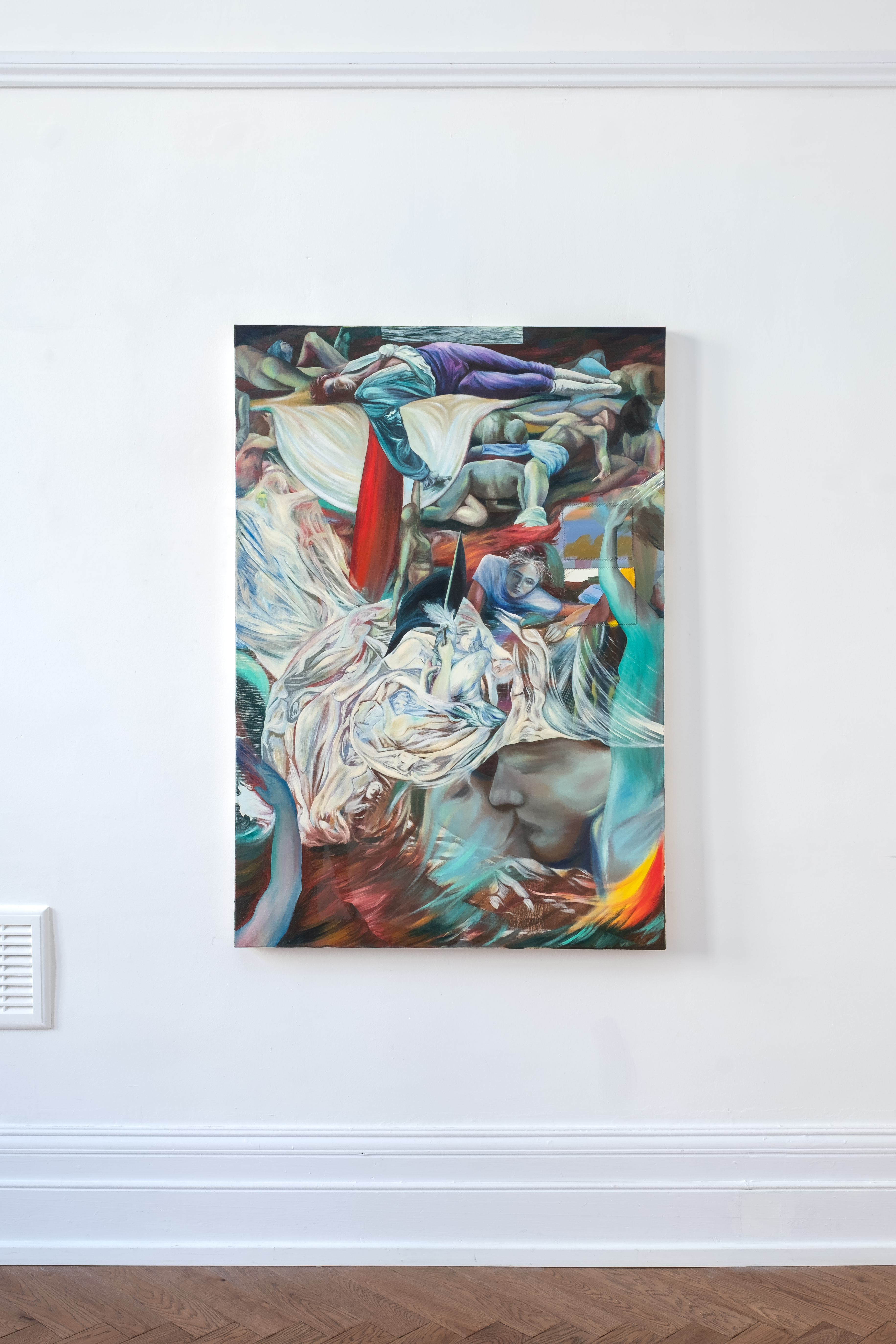 In these four works, Gaiger takes a developmental turn in her use of the figurative tradition to deepen her exploration of these themes into the language of metaphor. Contemporary issues of how people interact with the natural world are thus tied to the mythopoetic, and remind us that humans have wrestled with their place in the natural order for their entire existence as conscious beings. Gaiger here weaves a cascade of references into an elaborate visual spectacle. The central motif is a response to Herman Melville’s Moby Dick - the fateful journey to hunt the eponymous beast of the sea, a classic meditation on the awesome power of nature and hubris in the face of it. Tossed into the waves within the paintings are nods to other works of art, theatre and literature: the apocalyptic imaginings of William Blake, tragic Shakespearean love and loss, figures transplanted from Romantic paintings and allusions to Greek myth and Arthurian legend. Gaiger lifts these titanic examples from the artistic canon and renders them with her own deeply personal painterly sensibility; a palette taking on the zany hues of the home-camcorder, owing to earlier works in her career referencing family VHS tapes. The large ideas of the works being bound up with the intimate and the immediate.